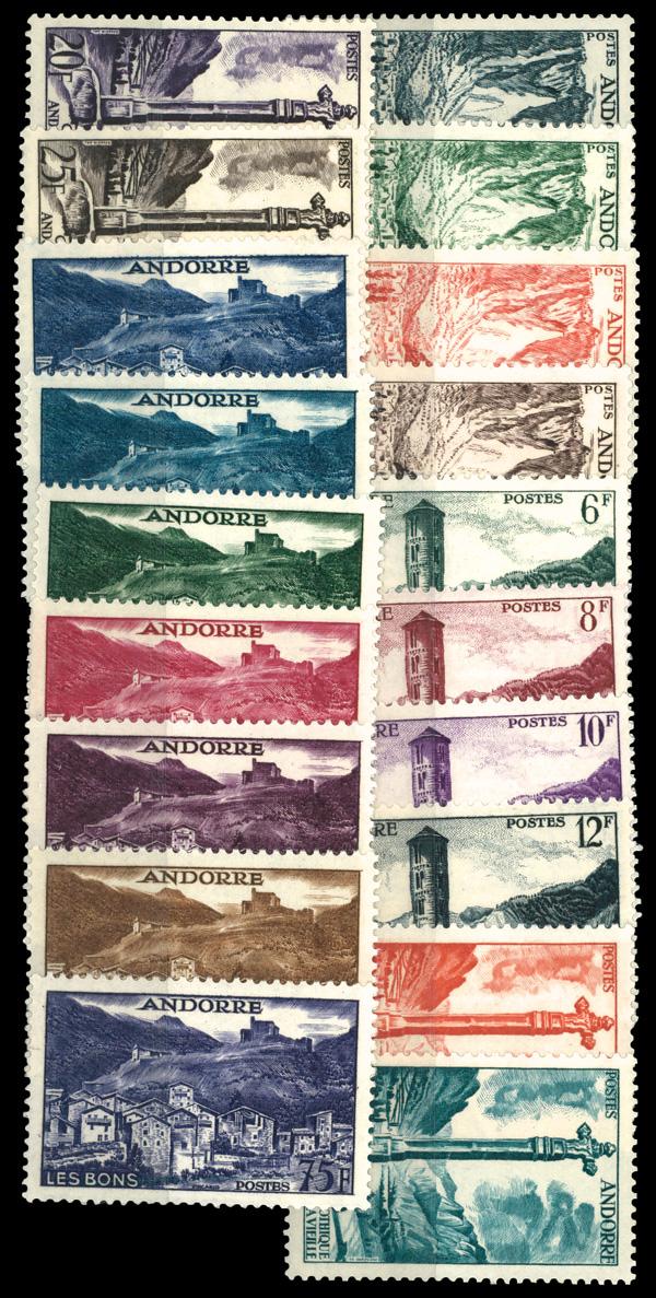 1955-1958, Pictorials 1fr dark gray blue - 75fr violet blue complete (Scott 124-143), complete set of singles, o.g., never hinged, Fine to Very Fine. Scott $205. (Image)
