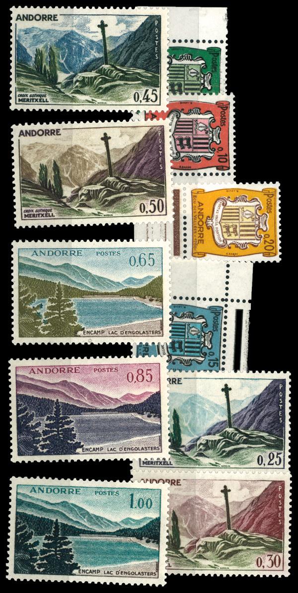 1961, Coat of Arms and Gothic Cross at Meritxell complete (Scott 143-153), complete set of single, o.g., never hinged, Fine to Very Fine. Scott $67. (Image)