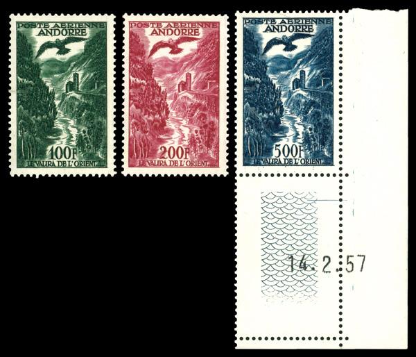 Airmail, 1955-57, 100f-500f Views complete (Scott C2-C4), complete set of singles, o.g., never hinged, Fine to Very Fine. Maury 2-4. Scott $169. (Image)