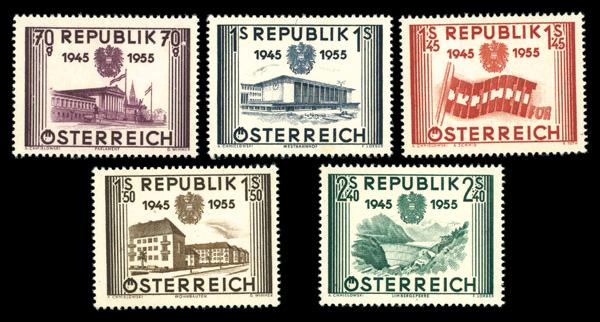 1955, Austria Liberation 10th Anniversary, complete (Scott 599-603), set of 5, o.g., never hinged (2.40S LH), Very Fine to Extremely Fine. Scott $43. (Image)
