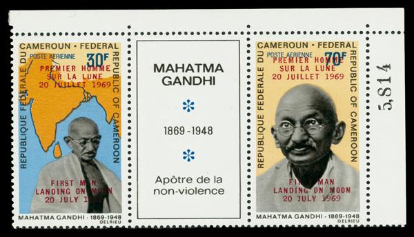 1969, Issued to Honor exponents of non-violence overinted for the First Man / Landing on Moon type II (Scott C111,C116), singles, o.g., never hinged, Fine to Very Fine, See foot note before Scott C117. Scott $110. (Image)