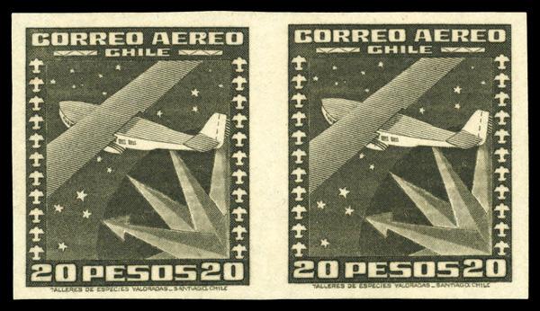 1945, Airplane and Southern Cross 20p olive gray imperforated (Scott C107a), pair, o.g., lightly hinged, Fine to Very Fine. Scott $70. (Image)