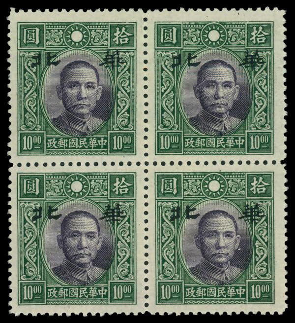 1942, $10 green & dull purple Dr. Sun Yat-sen surcharge (Scott 8N66), block of 4, o.g., never hinged, Fine to Very Fine. Scott $15. (Image)