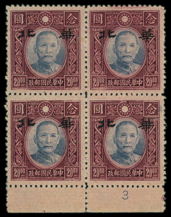 1942, $20 rose lake & dark blue Dr. Sun Yat-sen surcharge (Scott 8N84), bottom margin block of 4, o.g., never hinged, Fine to Very Fine. Scott $10. (Image)