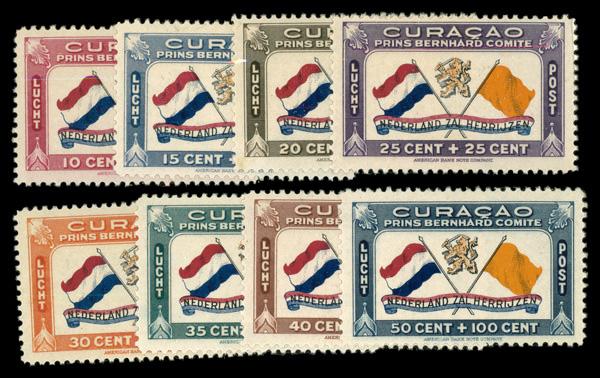 1941, Flag of the Netherlands and the House of Orange complete (Scott CB1-CB8), complete set of singles, o.g., lightly hinged, Fine to Very Fine. Scott $256. (Image)
