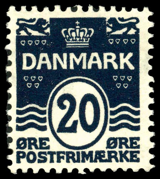 1912, Numeral with Wavy Lines, 20øre dark blue (Scott 64), single, o.g., never hinged, Fine to Very Fine. Michel 65. Facit 83. Scott $105. (Image)