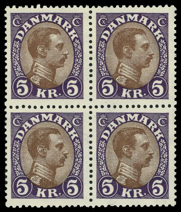 1927, King Christian X, 5kr violet & brown (Scott 130), block of 4, o.g., never hinged, Fine to Very Fine. Michel 175. Facit 163. Scott $40. (Image)