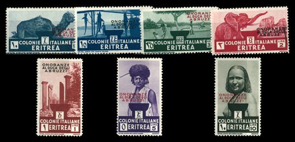 1934, Pictorials overprinted complete (Scott 168-174), complete set of singles, o.g., hinged, Fine to Very Fine. Scott $123. (Image)