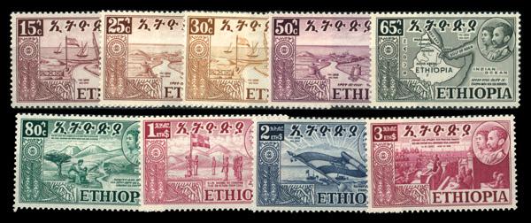 1952, Ethiopia's federation with Eritrea complete (Scott 327-335), complete set of singles, o.g., never hinged, Fine to Very Fine. Scott $102. (Image)