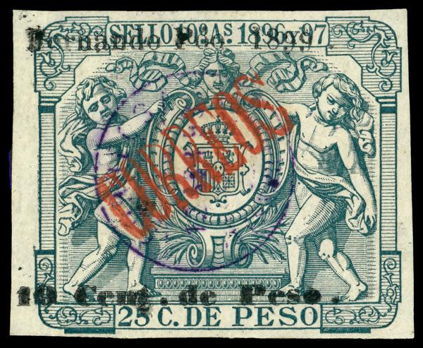 1899, Revenue 25c green surcharged 10c and hand stamped in red (Scott 42), single, unused without gum, Fine to Very Fine. Scott $120. (Image)