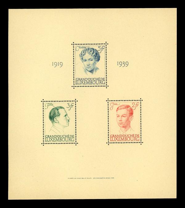 1939, Reign Anniversary of Grand Duchess Charlotte, souvenir sheet of 3 (Scott 217), o.g., never hinged, Extremely Fine. Michel Block 3. Scott $100. (Image)