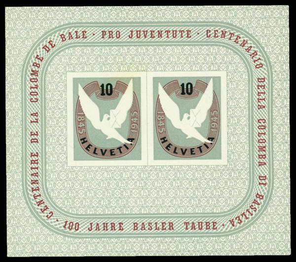 1945, Basel Dove souvenir sheet (Scott B144), o.g., never hinged, Extremely Fine. Michel Block 12. Zumstein 23. Scott $110. (Image)