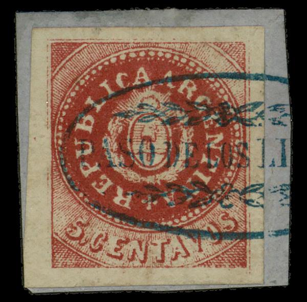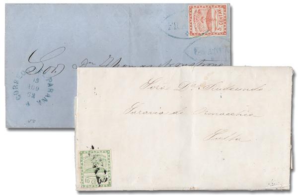 1858, Confederation, 5c red (Scott 1), 1.) 5c red tied by two blue FRANCA elipses on a clean folded cover with a clear Correo del Parana rimless c.d.s., Aug 15, 1862; Very Fine; and 2.) 10c green tied by weak straightline FRANCA on folded letter to Salta; several internal and edge separations; Fine. (Image)