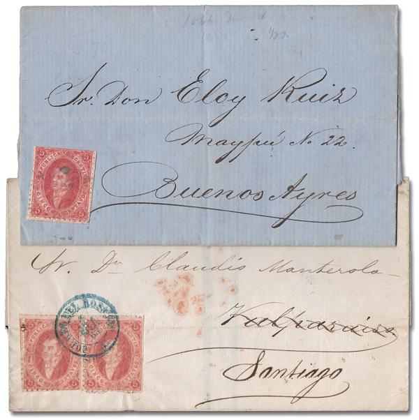 1865, Rivadavia, watermarked, perf 11½ 5c brown rose & 5c lake, Two covers (Scott 11, 11B), 1.) 5c brown rose horizontal pair tied by a blue Rosario c.d.s. on a folded cover with a black (mourning) border, addressed to Valparaiso, but changed to Santiago, Chile;and 2.) 5c lake tied by an indistinct blue grid on a folded letter datelined Uruguay, Jun 1865, to Buenos Aires, Very Fine. (Image)