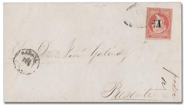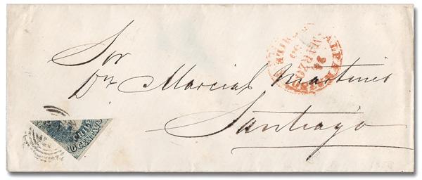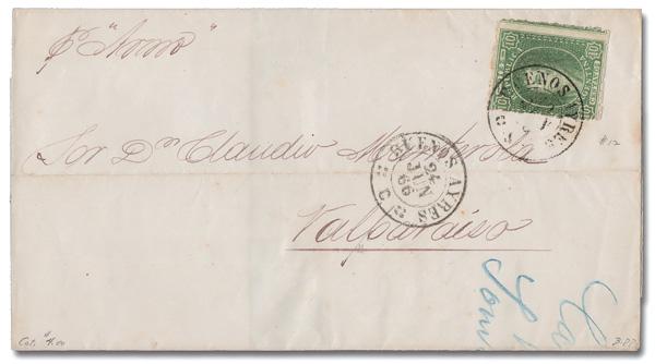 1864, Rivadavia, watermarked, perf 11½ 10c green (Scott 12), tied by one of two strikes Buenos Aires c.d.s.s, Jun 22, 1866, on a clean folded cover to Valparaiso, Very Fine. Scott $350. (Image)