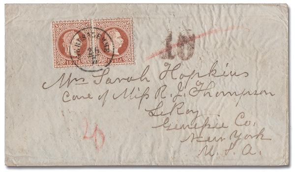 1867, Franz Joseph (fine printing), 15s orange brown, perf. 9½ (Scott 7 I), a fresh, perfectly centered horizontal pair tied by a neat Jerusalem c.d.s., Mar 26 (1873) on a cover to LeRoy, N.Y.; handstamped "10" rate changed to "20" with red crayon; backstamped Trieste (Apr 8) and NEW YORK/PAID ALL, Apr 24, Very Fine. Michel 5 IIA. Ferchenbauer 5 II; €725 pair on cover ($780). (Image)