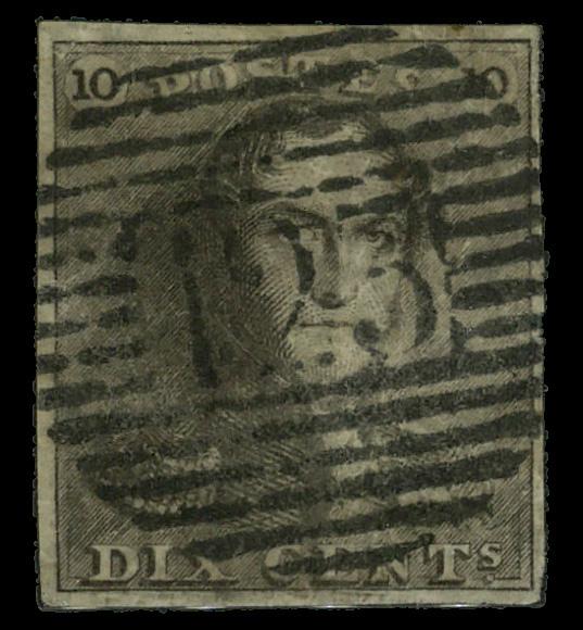 1849, 10c brown (Scott 1), single, Numerical cancel 123., Extremely Fine to Superb. Michel 1a. Scott $100. (Image)