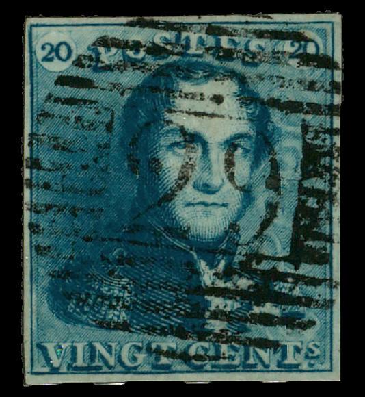 1849, 20c blue (Scott 2), single, Numerical cancel 29., Extremely Fine to Superb. Michel 2a. Scott $58. (Image)