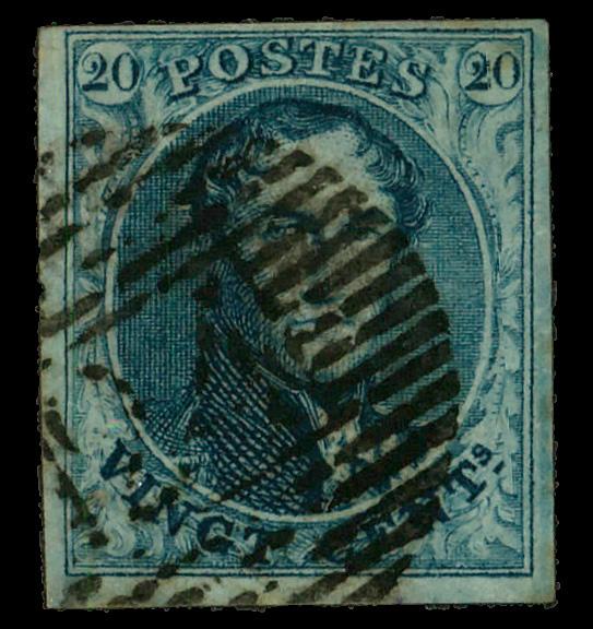 1849, 20c blue (Scott 2), nice margins and bright color, tied by a neat numeral cancel "4" on an exceptionally clean folded cover from Antwerp to Brussels; red Antwerp c.d.s. and blue Brussels backstamp, both Nov 8, 1849, Extremely Fine. Michel 2a. Scott $145. (Image)
