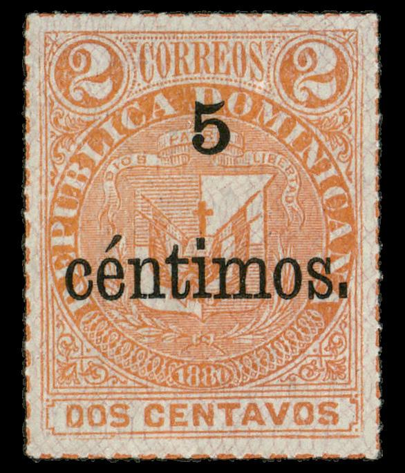 1883, 5c on 2c red Coat of Arms (Scott 74a), single, o.g., hinged, Extremely Fine. Scott $53. (Image)