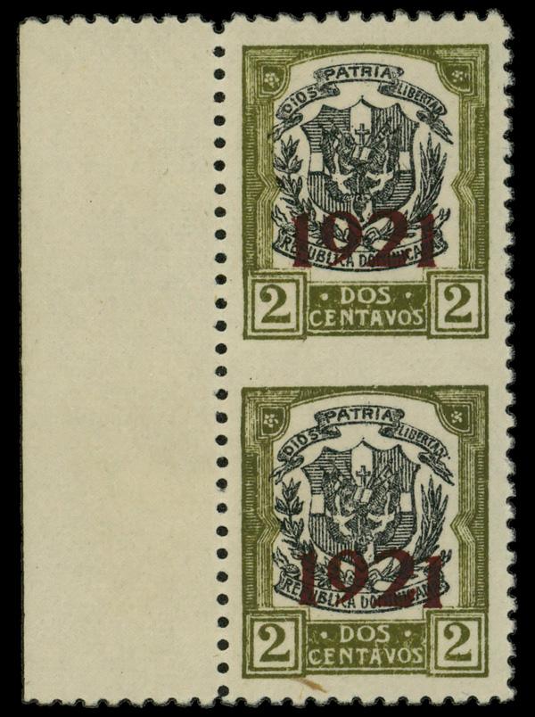 1921, 2c olive & black Coat of Arms overprinted 1921 in red (Scott 228a), vertical pair imperf between, o.g., never hinged, Extremely Fine. Scott $45. (Image)