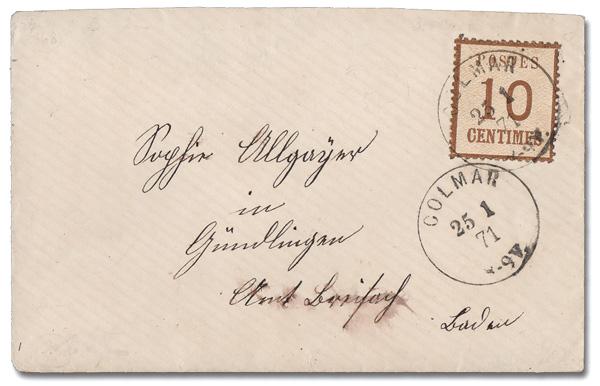 Alsace-Lorraine, 1870, 10c bister, burelage reversed (Scott N12), exceptionally well centered, tied by one of two strikes Colmar c.d.s., Jan 25, 1871 on a small cover; backstamped (?)breisach the next day, fresh and Very Fine. Yvert 5b. Scott $115. (Image)