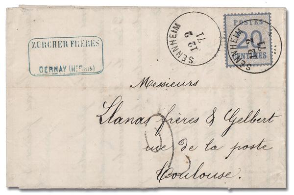 Alsace-Lorraine, 1870, 20c ultramarine, burelage reversed (Scott N13), beautifully well centered, tied by one of two strikes Sennheim c.d.s., Feb 12, 1871 on a folded letter to Toulouse; backstamped Lyon a Avignon, Feb 18, and Toulouse, Feb 19, Very Fine. Yvert 6b. Scott $275. (Image)