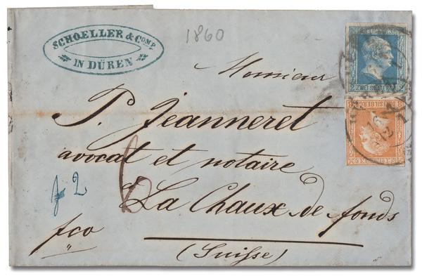 1857, 2sgr blue & 3sgr orange (Scott 7-8), 4-margin singles tied by Düren c.d.s.s, Jan 16, 1860, on a folded cover to Chaux de Fonds, Switzerland; backstamped Base, Jan 17, and Chaux de Fonds, Jan 18, Fine to Very Fine. Michel 7a. (Image)