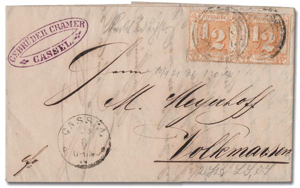 1865, ½sgr yellow (Scott 23), horizontal pair, tied by "14" numeral cancels (numerals not struck up) on a neat 1868 folded letter from Cassel (weak Jun 29 c.d.s.) to Volkmarsen (Jun 30 backstamp), Very Fine. Michel 37. Michel €220 ($240). (Image)