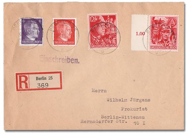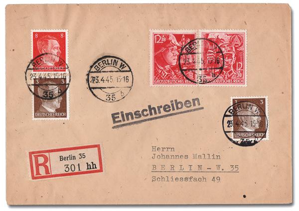 1945 Storm Trooper complete (Scott B292-B293), used with two 3pf and an 8pf Hitlerhead on a Registered local cover canceled Berlin W35 c.d.s. Apr 23, 1945 and backstamped with a different Berlin C35 c.d.s. the same day; light horizontal crease not affecting stamps, otherwise Very Fine. Michel 909-910. (Image)