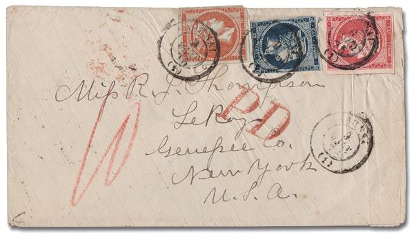 1875 Three-Color franking (Scott 19, 20, 22), 10L orange, 20L blue & 80L carmine on an 1875 cover from Athens to LeRoy, N.Y.; stamps tied by three of four May 9 Athens c.d.s.s; red "PD" on the front and backstamped Triest, May 27, and "New York/Paid All", Jun 12; 10L stamp extends slightly above the cover, Fine to Very Fine. (Image)