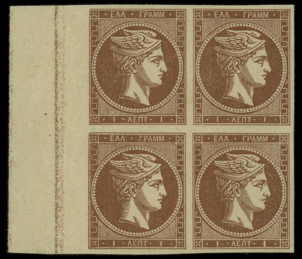 1875, Hermes Head, Athens print, 1L gray brown on cream (Scott 43), block of 4, o.g., 3 stamps never hinged, Extremely Fine to Superb, top left stamp is hinged. Michel 53 a. Scott $60. (Image)