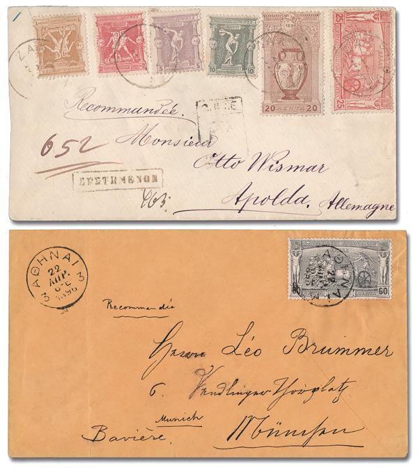 1896 Olympics, Two covers (Scott 117//124), 1.) First six values (117-122) on a Registered cover from Zakynthos to Apolda via Corfu, Jul 1896, and 2.) the 60L black (124) single franking from Athens to Munich (no backstamp). Apr 1896, Very Fine. (Image)
