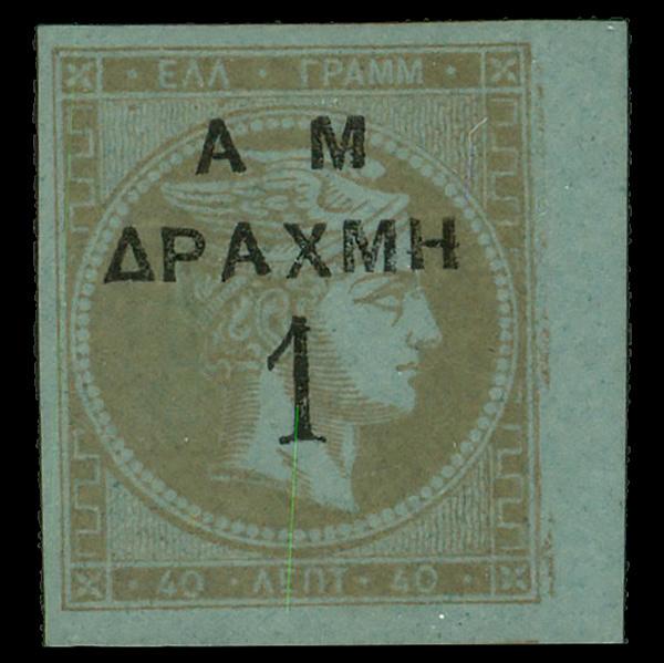 1900, "A M" (Gold) surcharge on Hermes Head, imperf., 1d on 40L brown on blue (Scott 153), Extremely Fine to Superb. Michel 123 B. Scott $125. (Image)