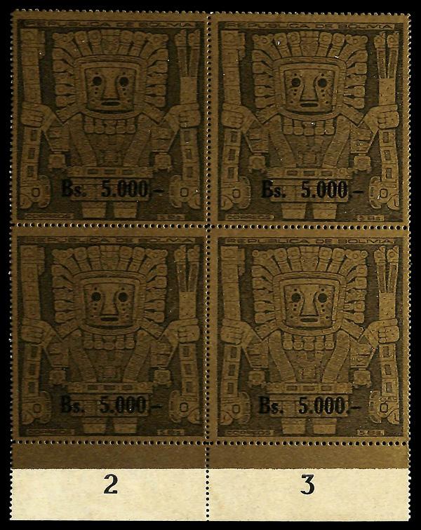 1960, 5000b on 5b gray on gold Gate of the Sun (Scott 450), block of 4, o.g., never hinged, Very Fine to Extremely Fine. Scott $72. (Image)
