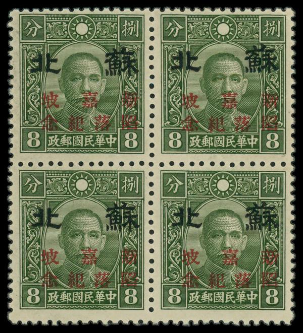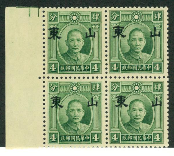 19414c green Dr. Sun Yat-sen overprinted (Scott 6N2a), left margin block of 4, o.g., never hinged, Fine to Very Fine. Scott $37. (Image)