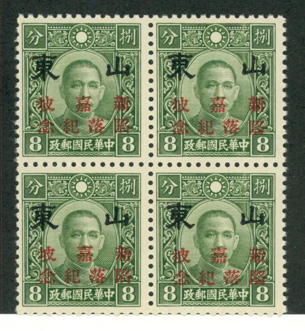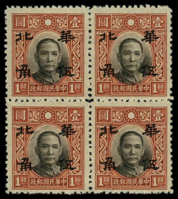 1942, Honan Singapore overprint in red (Scott 6N64), block of 4, o.g., never hinged, Fine to Very Fine. Scott $40. (Image)