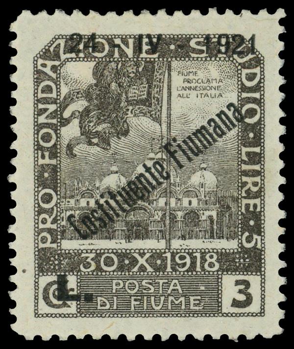 1921, Church of St. Mark's, Venice 3cor +5l black brown overprinted for the First Constituent Assembly (Scott 158), single, o.g., hinged, Fine to Very Fine. Scott $120. (Image)