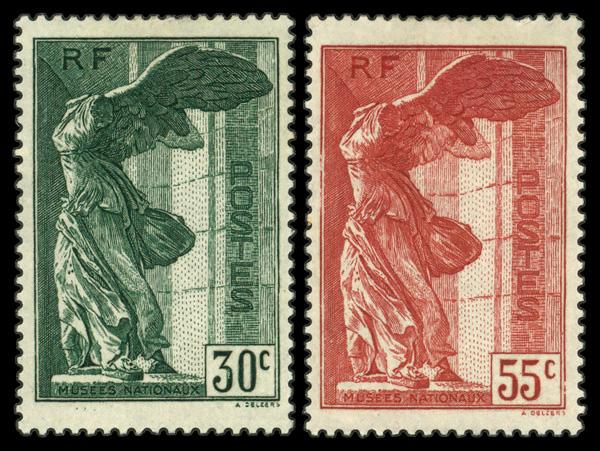 1937, Winged Victory of Samothrace complete (Scott B66-B67), set of 2, singles, o.g., hinged, Fine to Very Fine. Yvert 354-355. Scott $130. (Image)