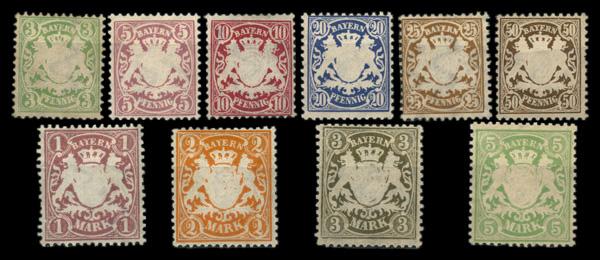 1881-1906, 3pf-5m Arms complete (Scott 48-57), complete set of singles, o.g., hinged, Fine to Very Fine. SG 385. Michel 47-53,64,69,70. (Image)