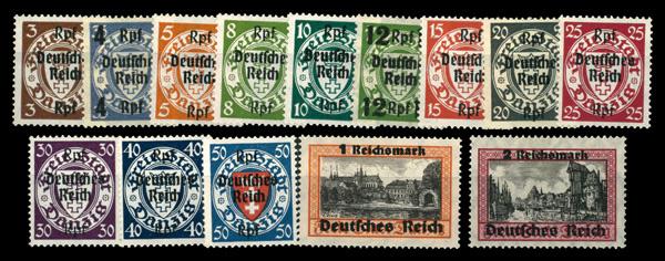 1930, Coat of Arms 5pf - 1g overprinted in black, violey or red complete (Scott 200-210), complete set of single, Fine to Very Fine, signed GPSv. Scott $413. (Image)