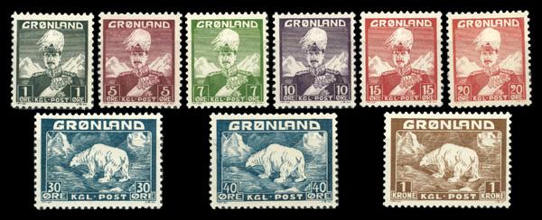 1938-46, King Christian X and Polar Bear, 1øre to 1kr complete (Scott 1-9), set of 9, complete set of single, o.g., never hinged, Fine to Very Fine. Facit 1-9. Scott $90. (Image)