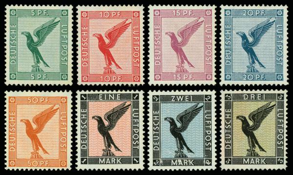 Airmail, 1926-27, 5pf-3m Eagle complete (Scott C27-C34), o.g., never hinged, Very Fine. Michel 378-384. Scott $900. (Image)