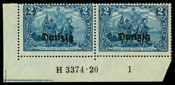 1920, Germany 2m blue 'Danzig' overprint (Scott 11), corner margin pair with HAN A#, o.g., never hinged, Fine. Michel Mi11a; €100 ($110). (Image)