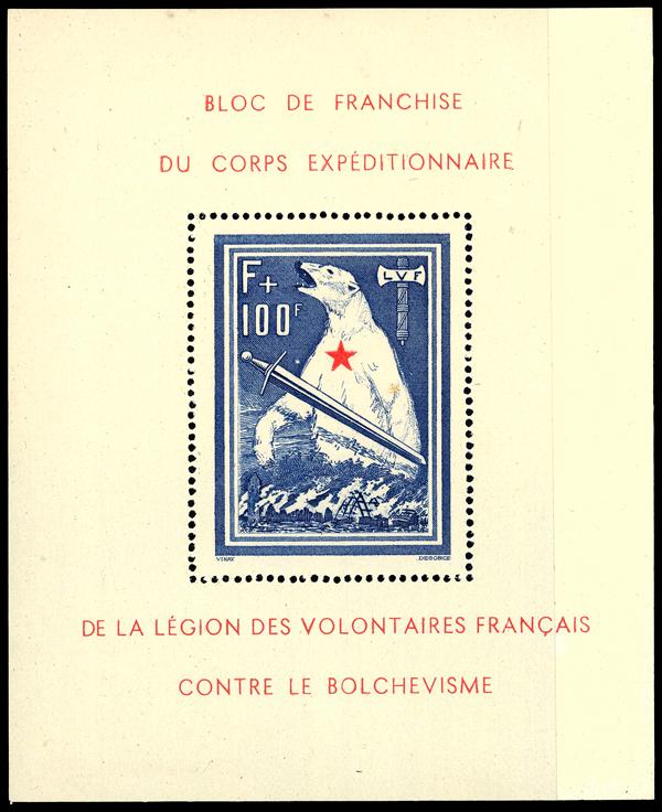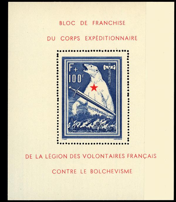 1941, +100fr French Volunteer Legion, souvenir sheet, o.g., never hinged, Extremely Fine. Michel I; €800 ($860). (Image)