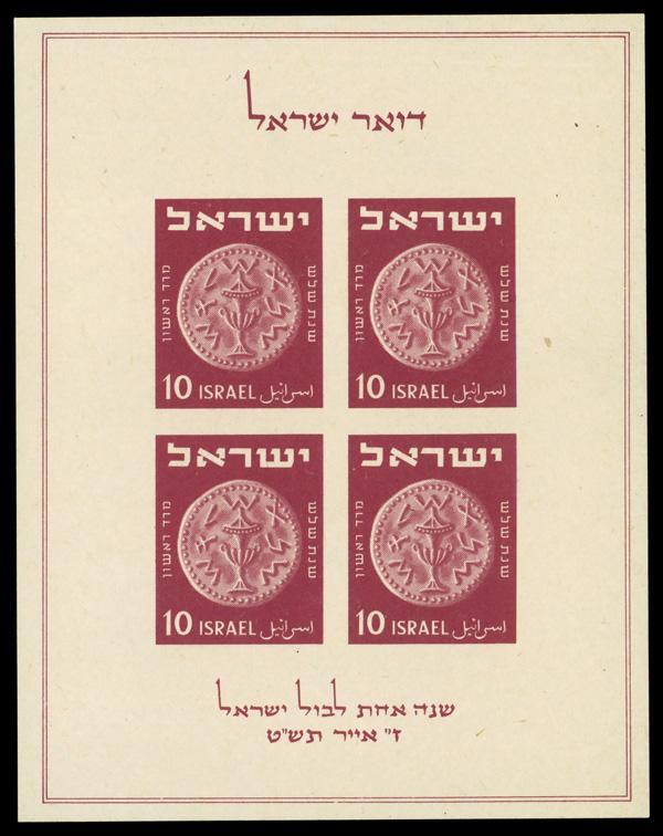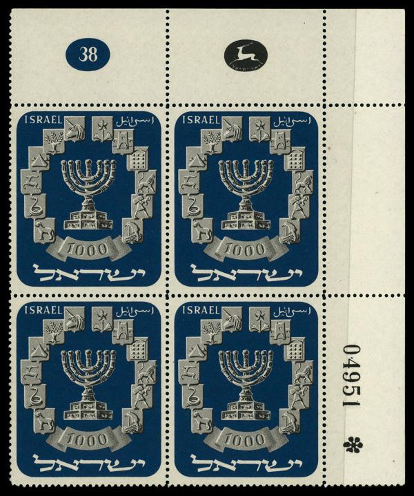 1952, 1000p Menorah (Scott 55), plate block of 4, o.g., never hinged, Very Fine. Bale 59; $75. (Image)