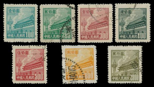 1950, Tien An Men 3rd Issue (R3) complete (Scott 65-71), without gum as issued, Very Fine to Extremely Fine. Yang R13-19. Scott $55. (Image)