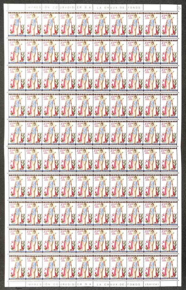 1959, 5p Miss Universe Air Post (Scott C318), complete sheet of 100, o.g., never hinged, bright colors on radiant white paper; folded along center row of horizontal perfs, still an Extremely Fine and valuable sheet, signed Temprano on bottom left stamp, with 2012 Temprano certificate. Yvert A316. Scott $4,500 as singles. (Image)