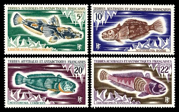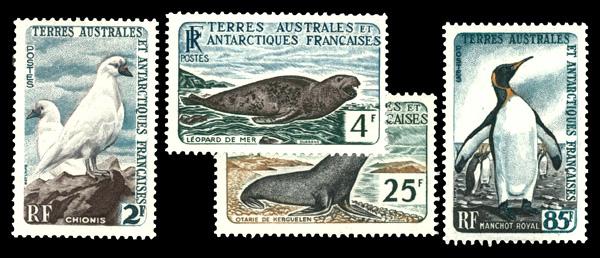 1960, Antarctic Fauna, 2fr to 85fr complete (Scott 16-19), complete set of single, o.g., never hinged, Fine to Very Fine. Yvert 13A, 13B, 16, 17. Maury 16-19. Scott $105. (Image)