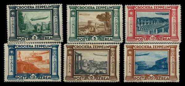 1933, Zeppelin over Italian Landmarks complete (Scott C42-C47), complete set of singles, o.g., never hinged, Fine to Very Fine. Scott $330. (Image)